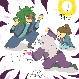 読み手が最初に部屋のどこかに伊作を隠してかるたを始めるという変なルールが出来上がりました。