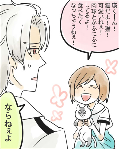 という会話していると瑛は疎外感を味わい、自分も猫が好きだったらな…とか少しだけ後悔すれば良いです。